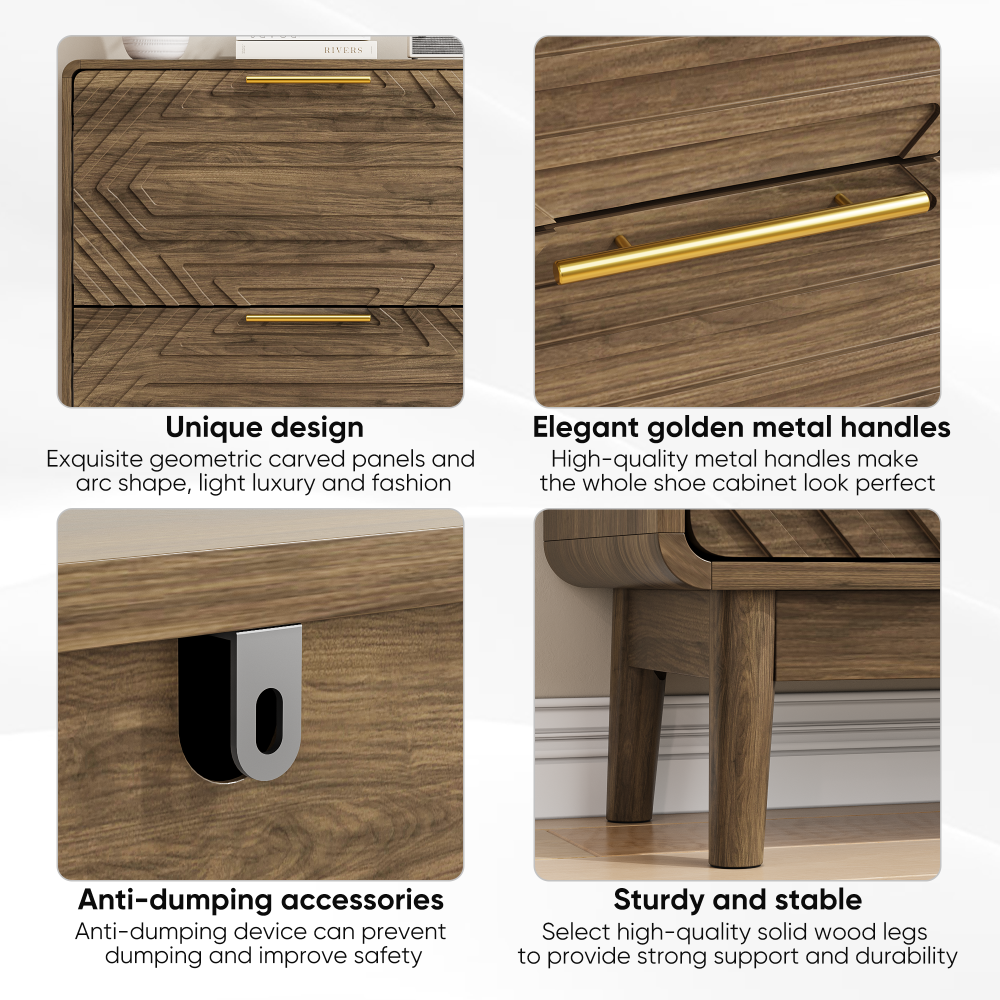 - 【Farmhouse Design】This shoe cabinet features a unique geometric carved panel and gold handles, adding elegant texture and visual interest to any decor. It looks simple and stylish, bringing a warm and cozy color to your living area. It can be used not only as furniture, but also as home decoration.